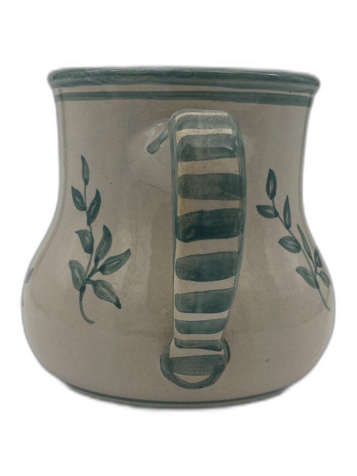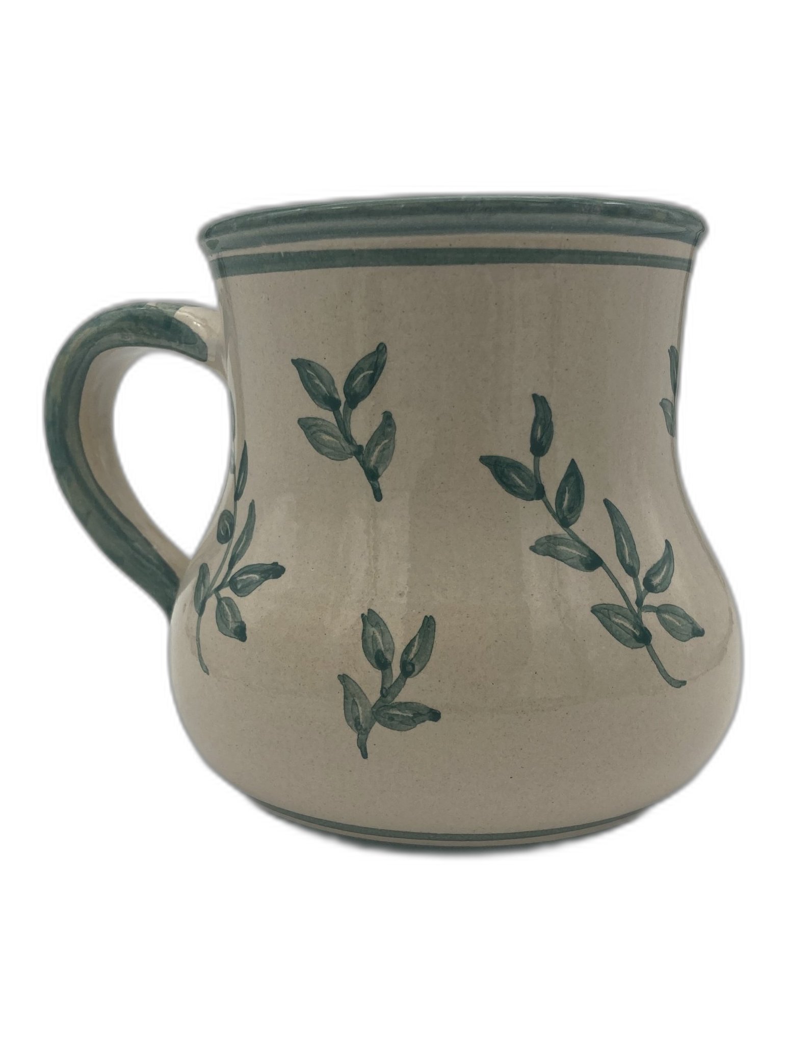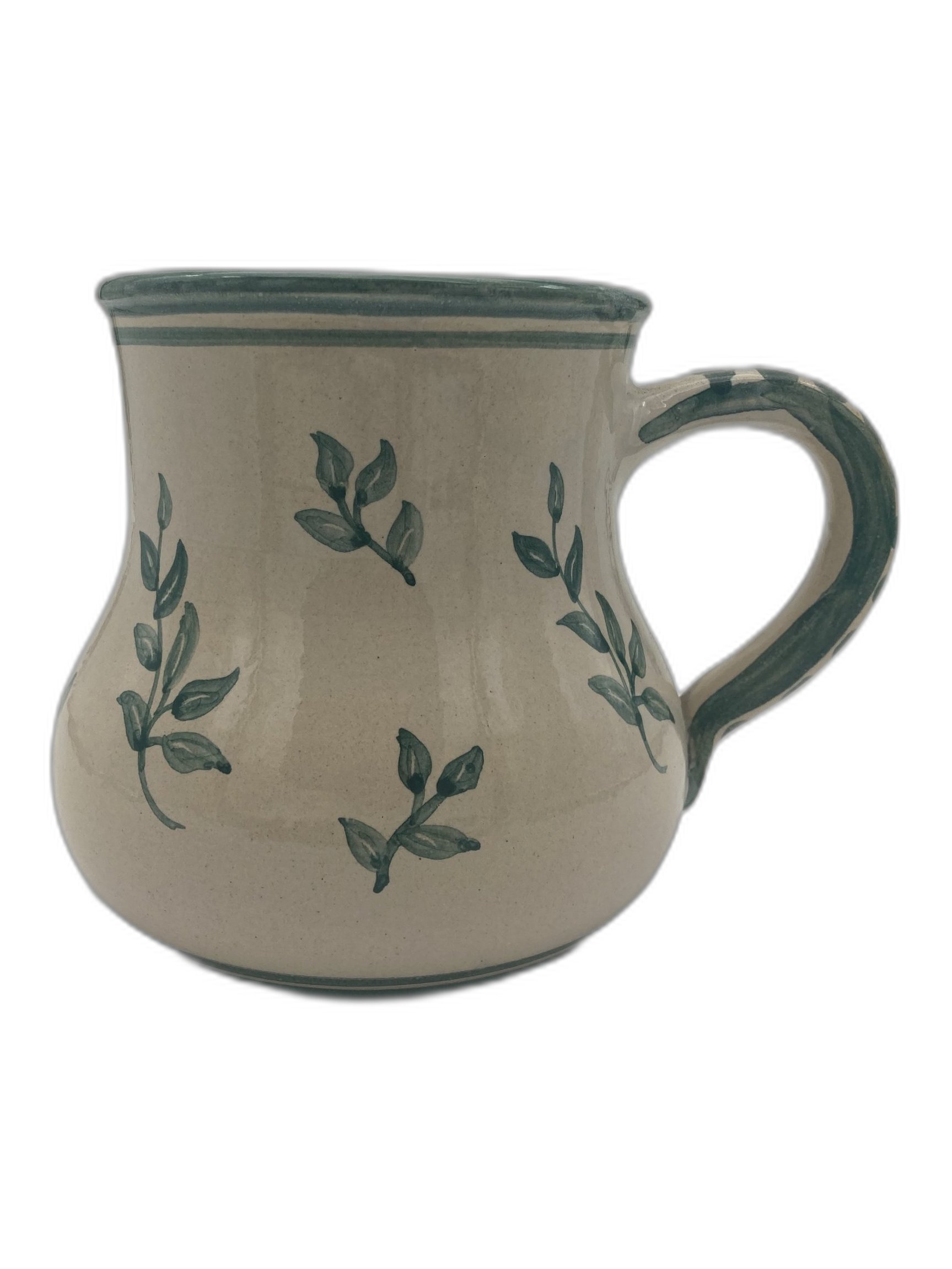 Diese bauchige Keramiktasse bringt gemütliches Landhaus-Flair an den Frühstückstisch. Der cremefarbene Grundton wird von handgemalten grünen Zweigen umspielt; Rand und Henkel sind liebevoll mit Streifen akzentuiert. Die weiche Silhouette liegt angenehm in der Hand – ideal für Kaffee, Tee oder Kakao.