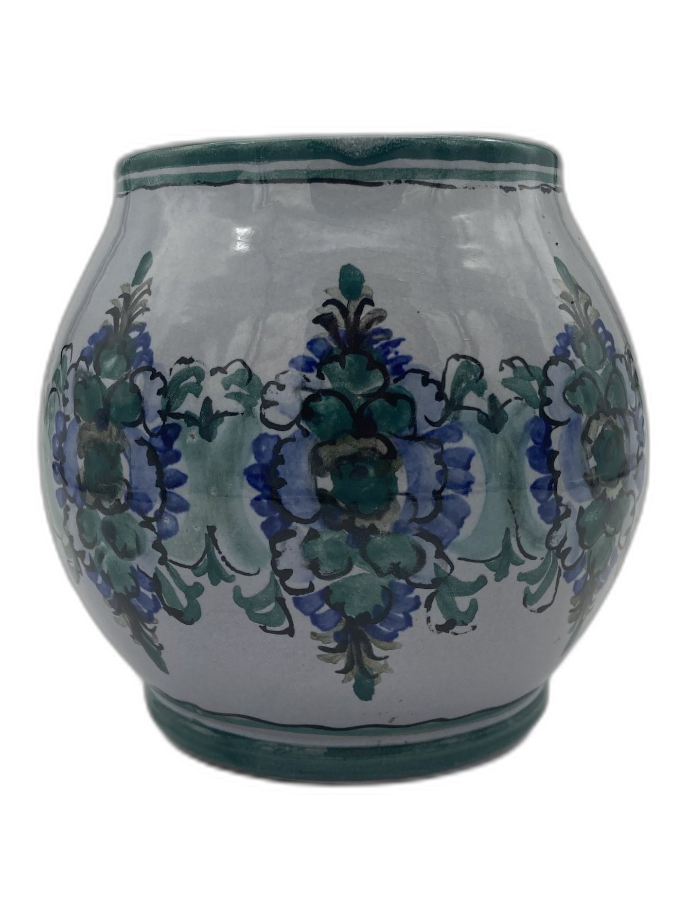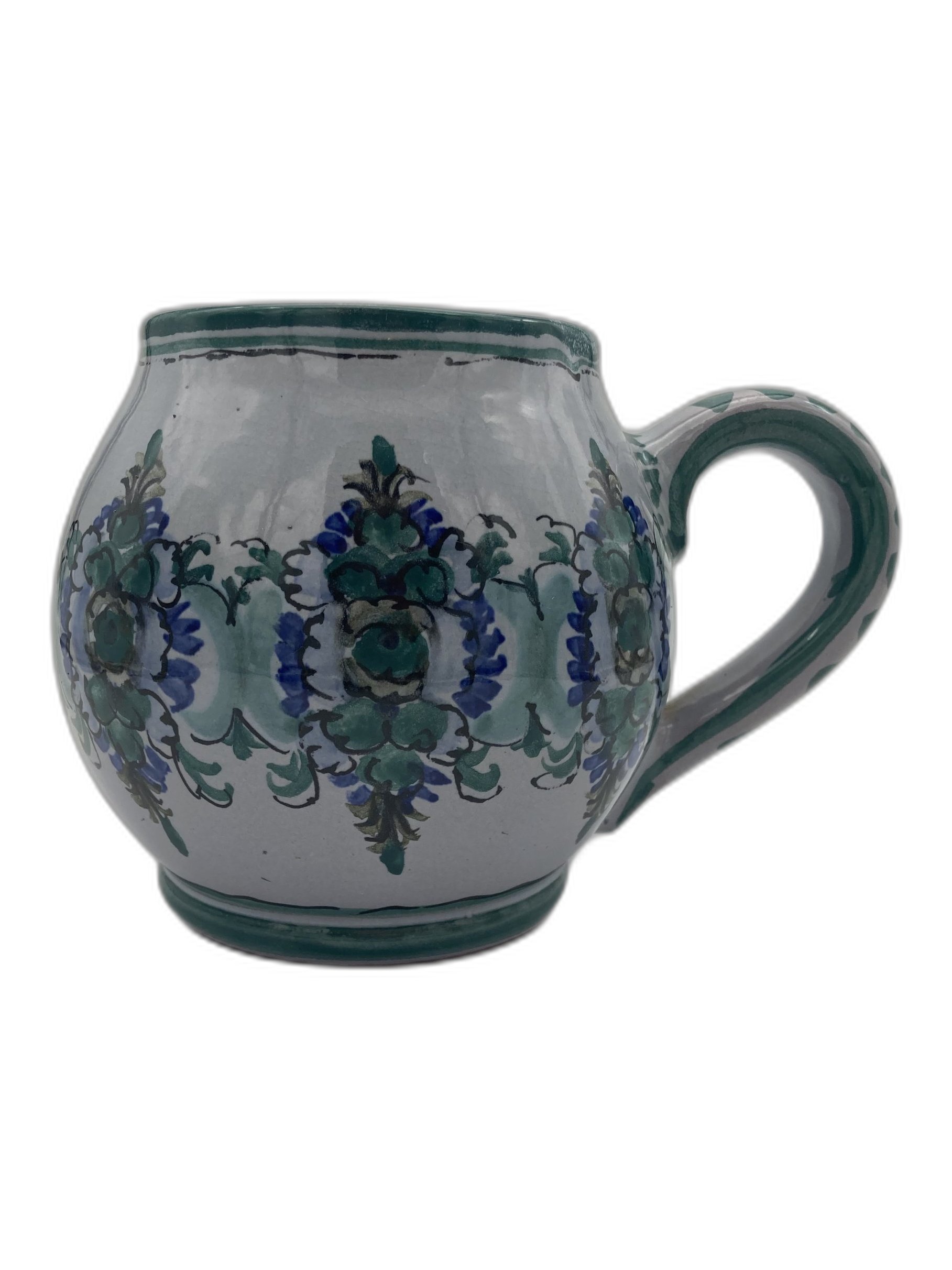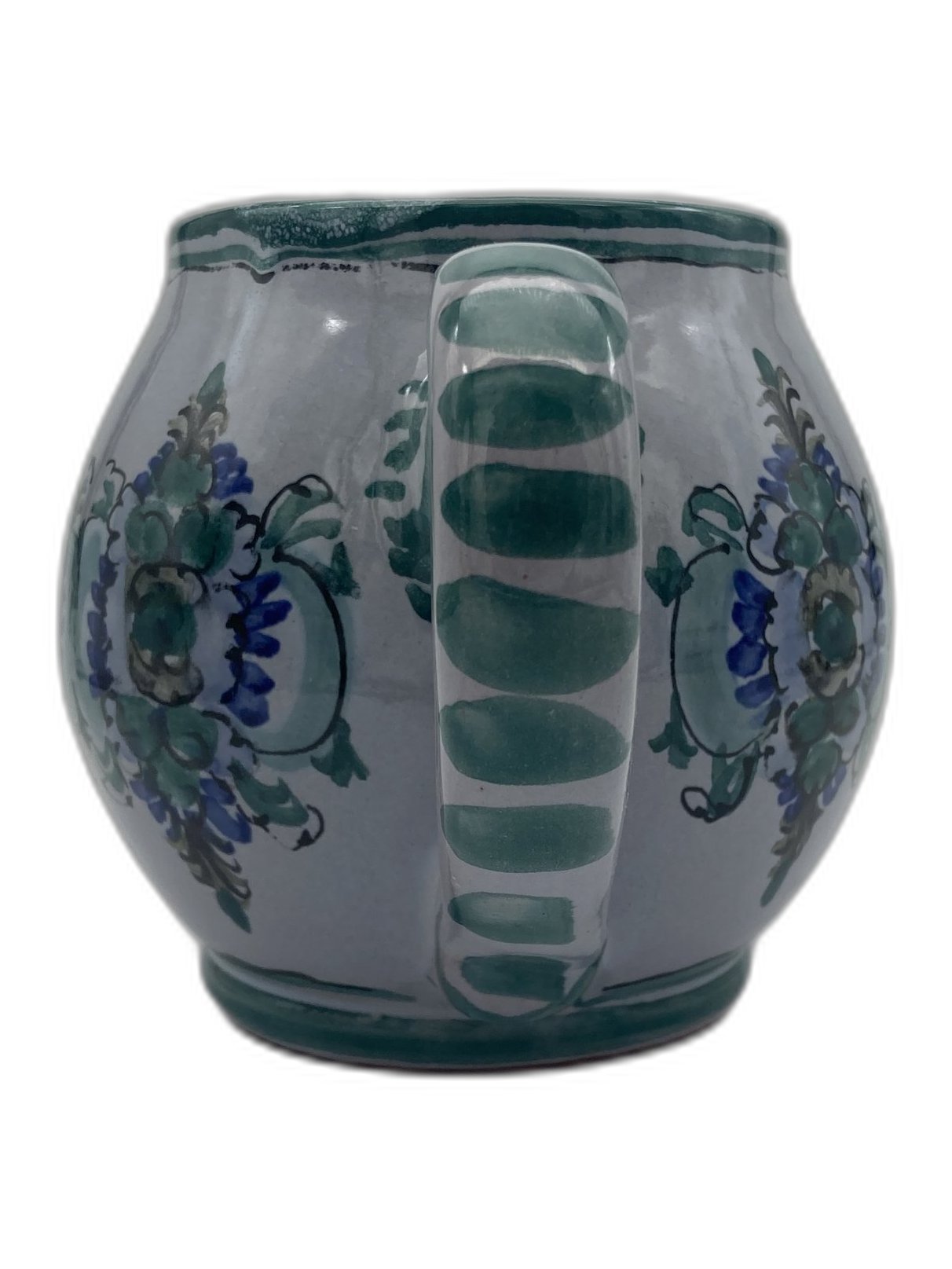 Handbemalter Bierkrug mit blau-grünem Floraldekor. Maße: H 12 cm, B 17 cm, L 13 cm. Gewicht ca. 494 g. Bayerische Töpferei – stilecht und gemütlich.