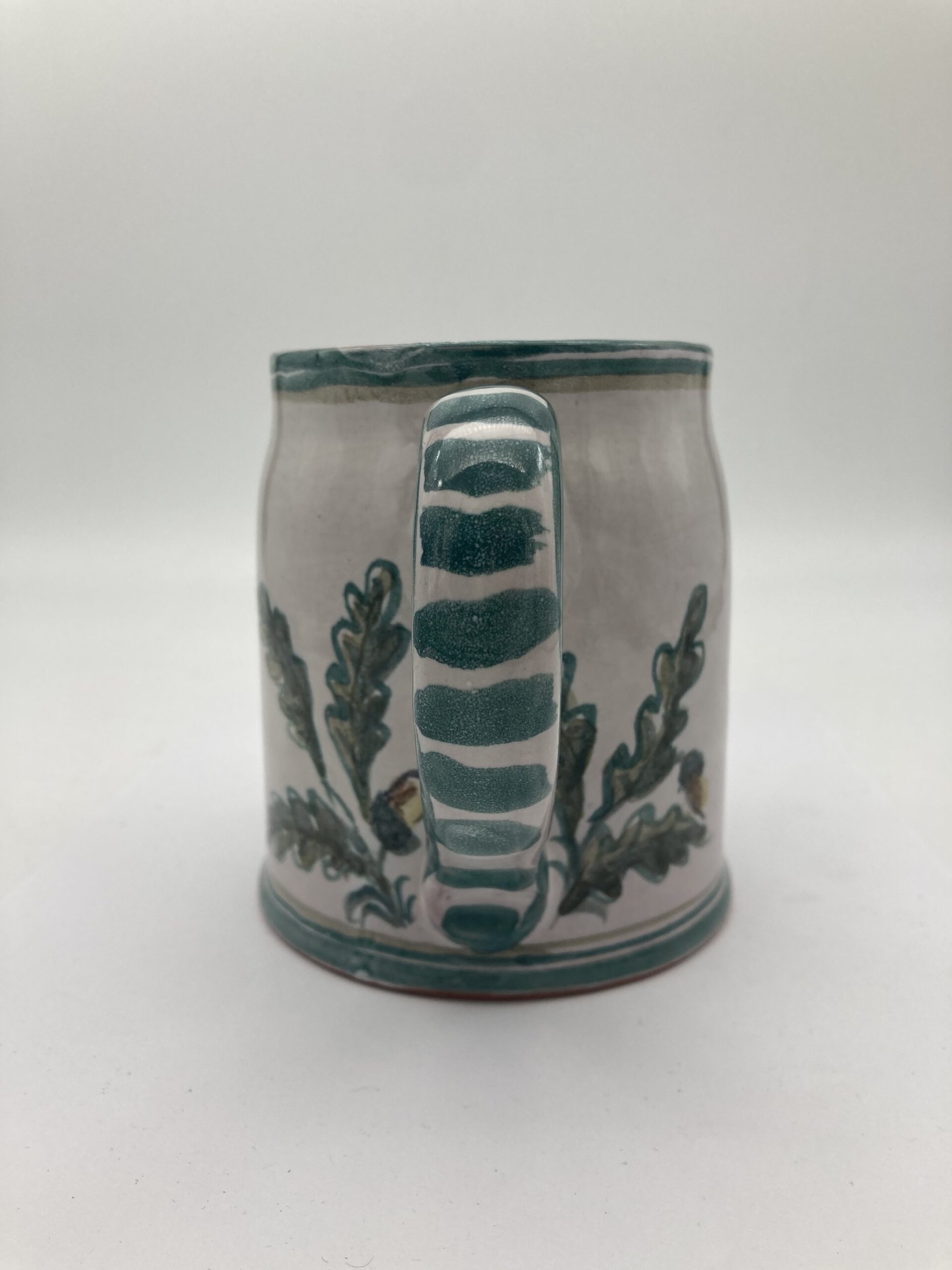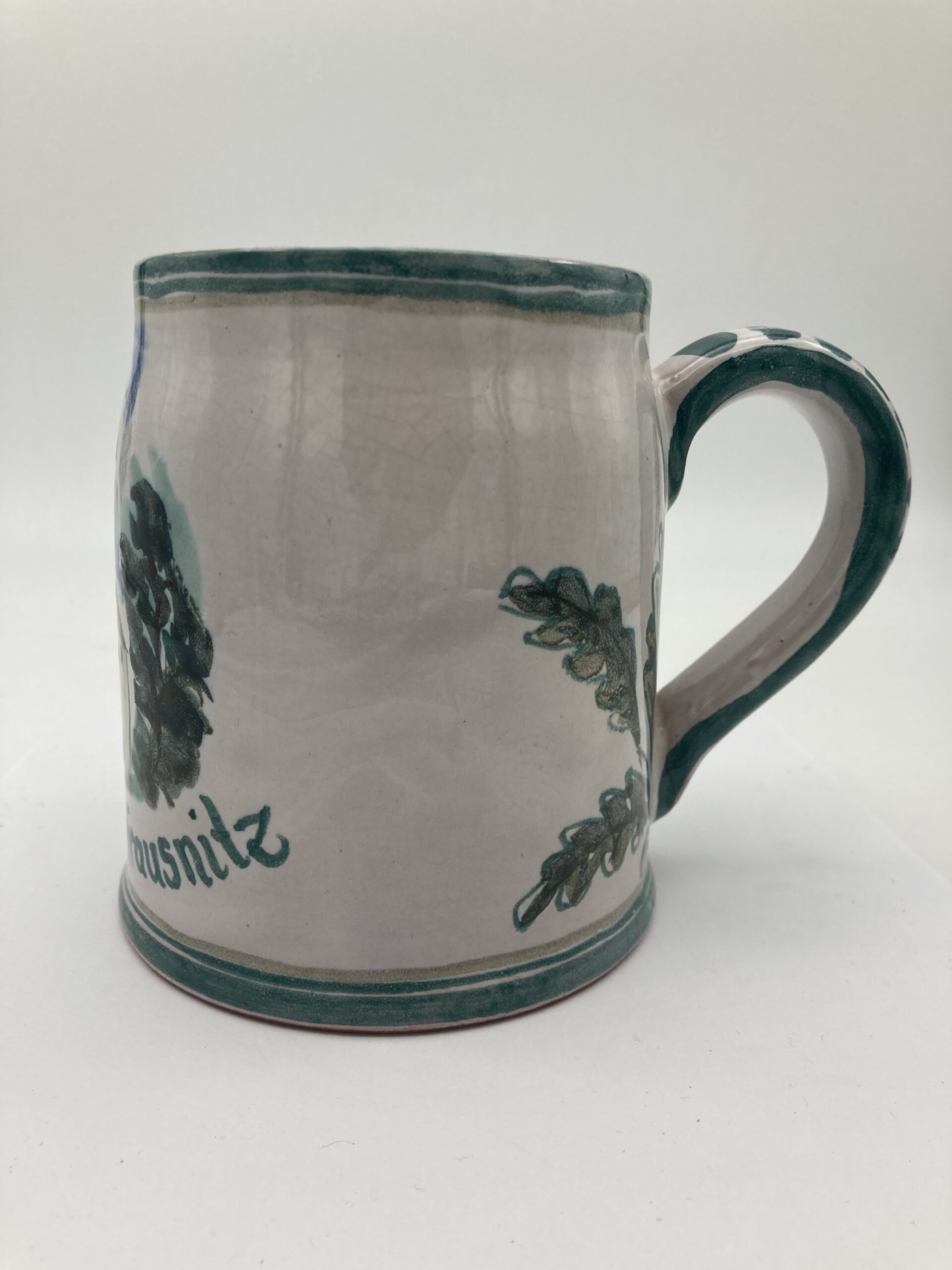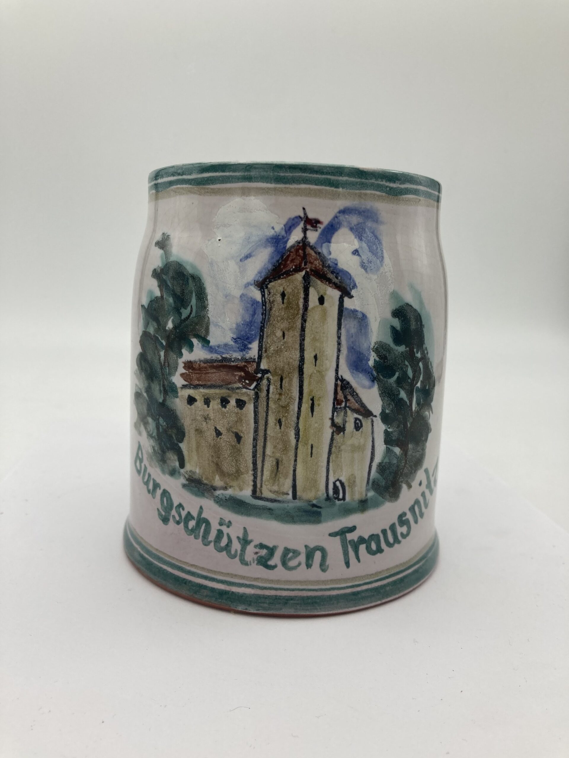 Stimmungsvoller Keramik-Bierkrug aus unserer bayerischen Töpferei, handbemalt mit der Burg Trausnitz und umrahmt von Eichenlaub. Grüne Konturen und ein griffiger Henkel runden das traditionelle Design ab – perfekt für gemütliche Abende und als Andenken an Bayern.