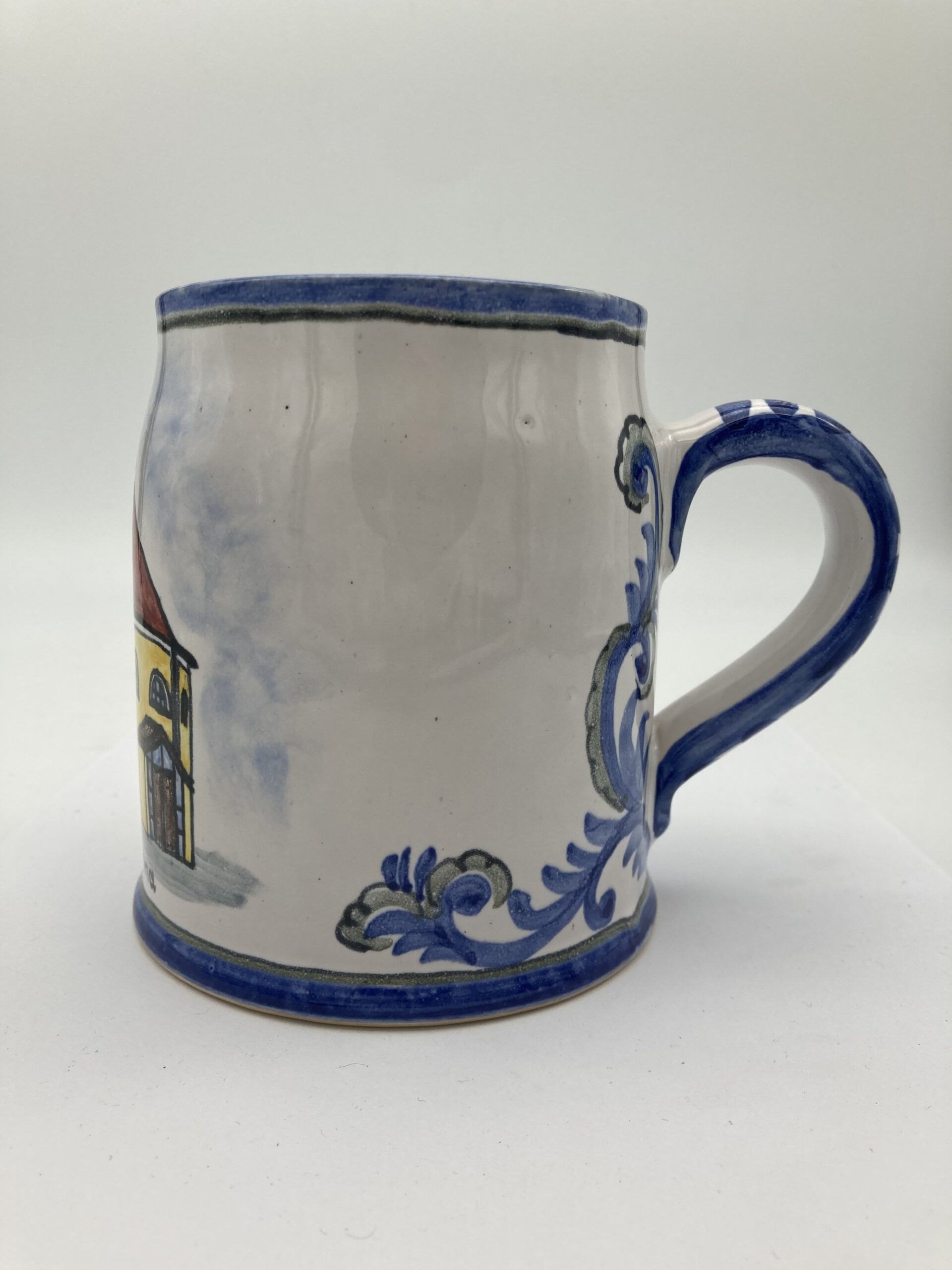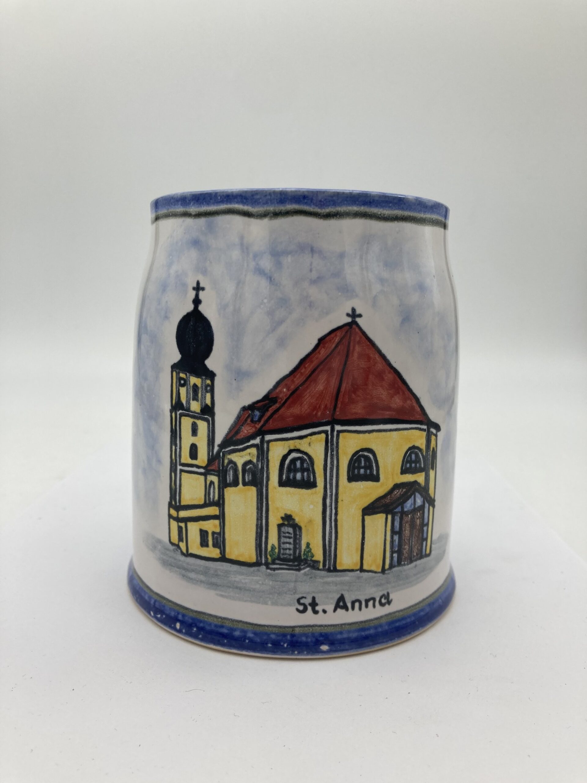 Dieser liebevoll bemalte Bierkrug zeigt die Kirche St. Anna aus Wernberg in warmen Gelb- und Rottönen, eingerahmt von blauem Rand und floralen Ornamenten. Jedes Detail wurde in unserer bayerischen Töpferei per Hand aufgetragen – so entsteht ein charakterstarkes Unikat, das Heimatgefühl an den Tisch bringt.