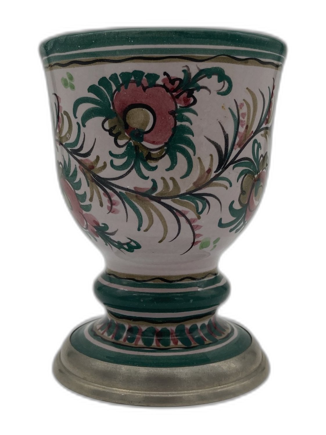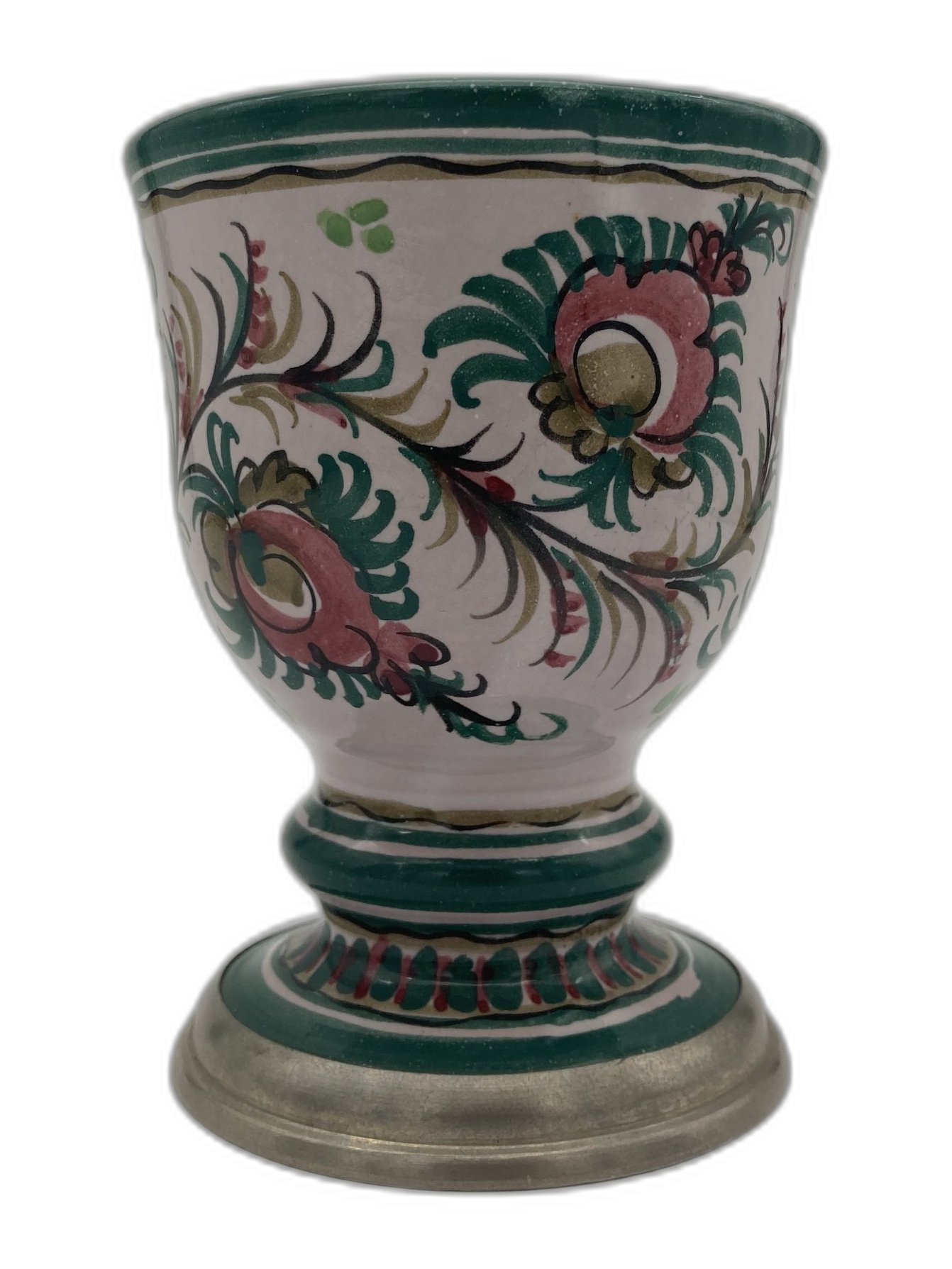Eleganter Weinbecher aus Keramik mit zartem Blumenmotiv in Rosa und Grün und feinen hellbraunen Akzenten. Der Becher steht auf einem dekorativen Zinnfuß und überzeugt durch seine ausgewogene Form und das detailreiche Dekor. Mit einer Höhe von ca. 11 cm und einem oberen Durchmesser von ca. 8,5 cm ist er ideal für festliche Anlässe oder als besonderes Geschenk.