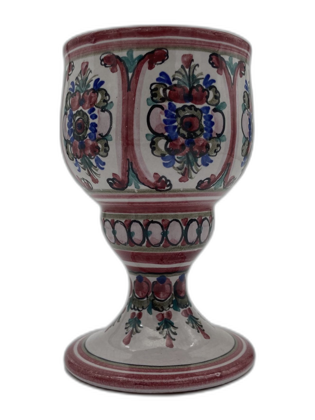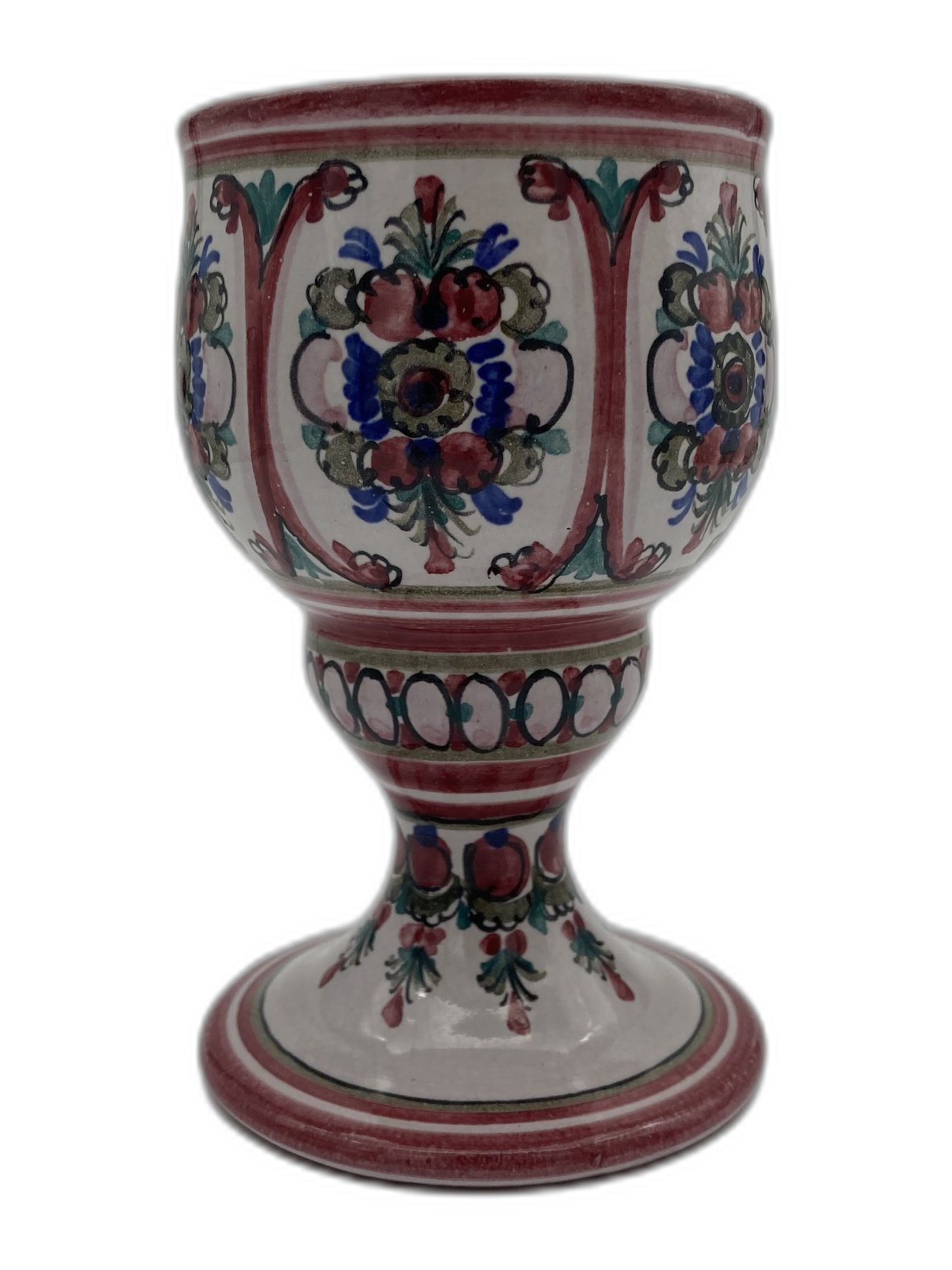 Dieser elegante Weinbecher aus Keramik besticht durch ein feines, traditionelles Blumenmuster in Rot-, Blau- und Grüntönen. Der standfeste Fuß und die harmonische Form machen ihn zu einem schönen Blickfang auf jedem Tisch – egal ob als Gebrauchsstück für festliche Anlässe oder als dekoratives Highlight in Ihrer Vitrine. Jedes Motiv wurde sorgfältig von Hand bemalt, weshalb kleine Variationen das individuelle Charme dieses Stücks unterstreichen.