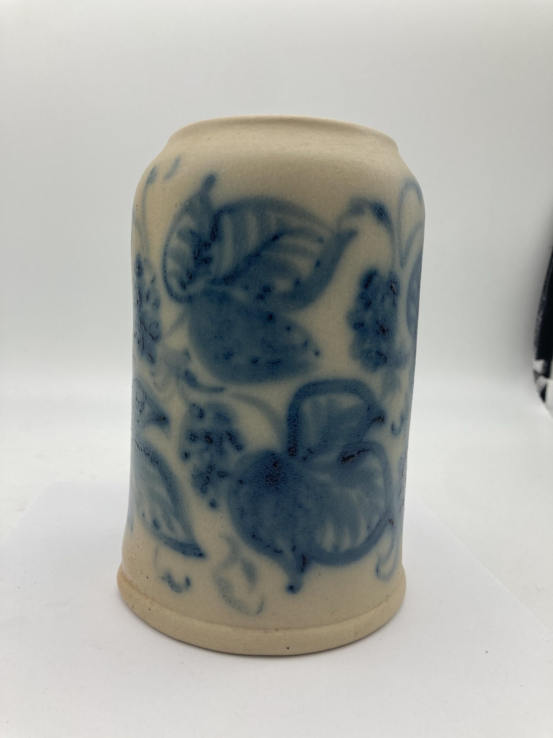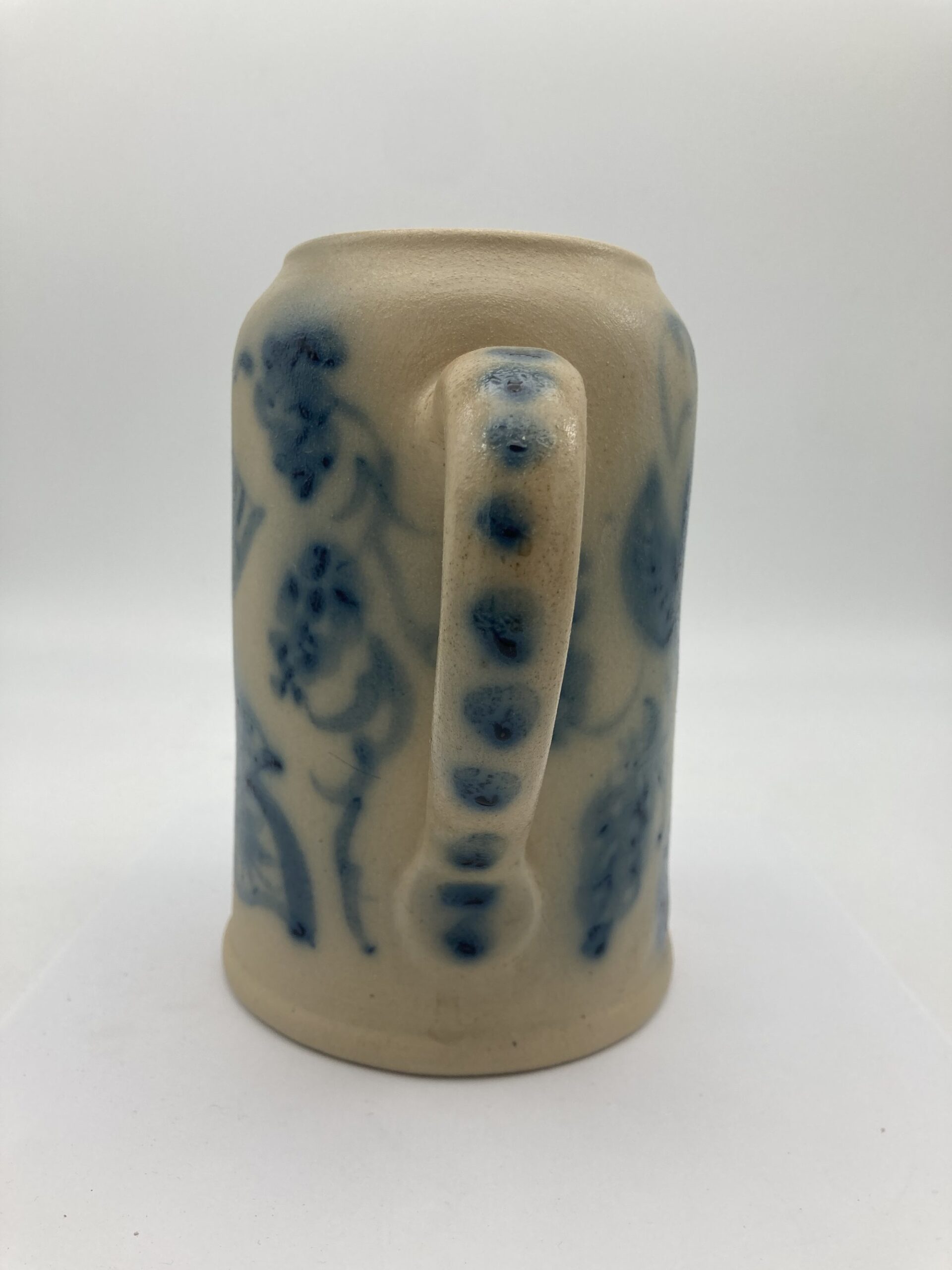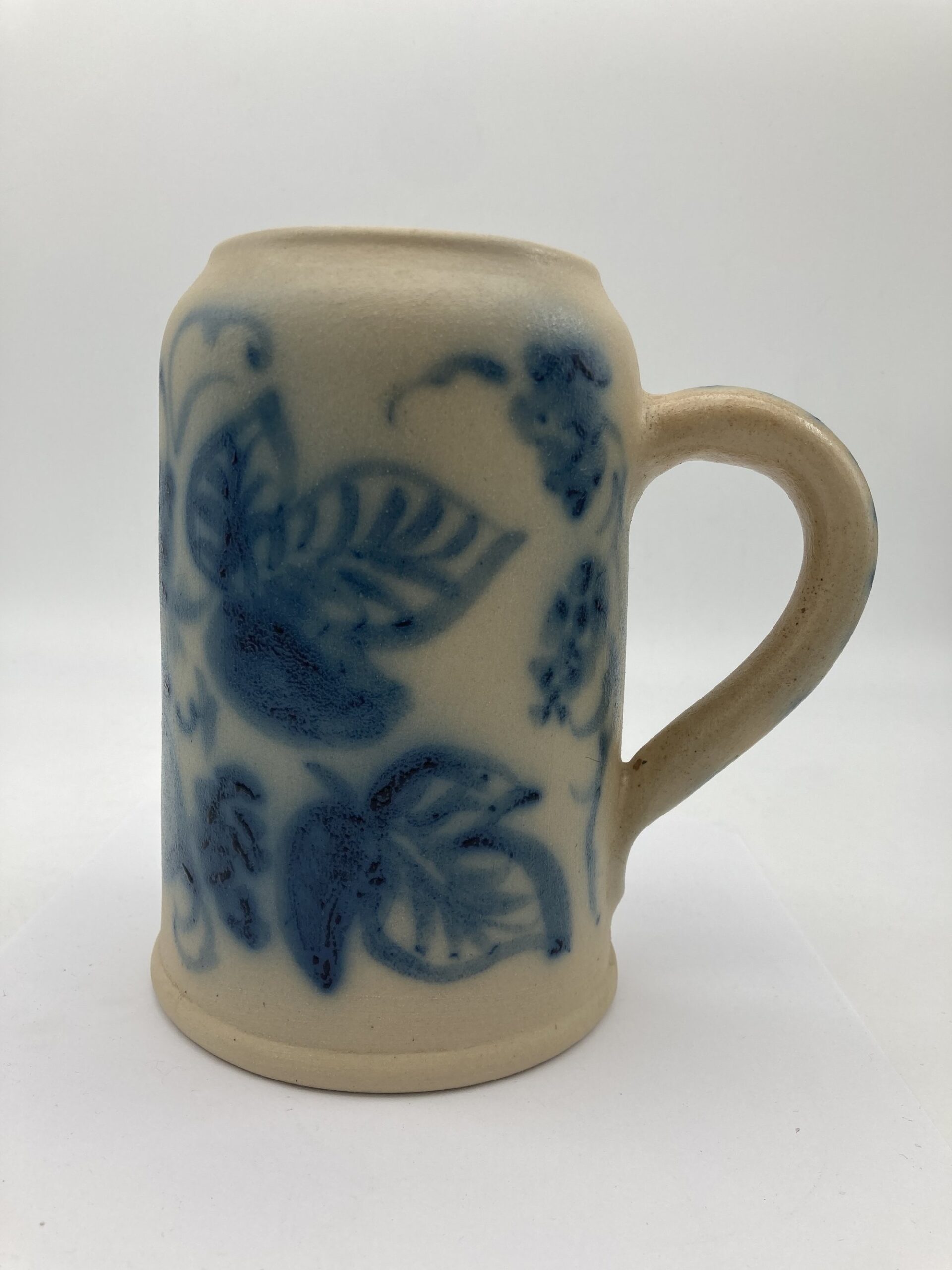 Ein charaktervoller Bierkrug aus unserer bayerischen Töpferei: warmer Creme-Ton mit lebendigem blauem Blatt- und Beerenmotiv. Der geschwungene Henkel liegt angenehm in der Hand und macht jede Brotzeit- oder Feierabendrunde zum Genuss. Jedes Stück ist von Hand gemacht und bemalt – so wird dein Krug zu einem unverwechselbaren Unikat.