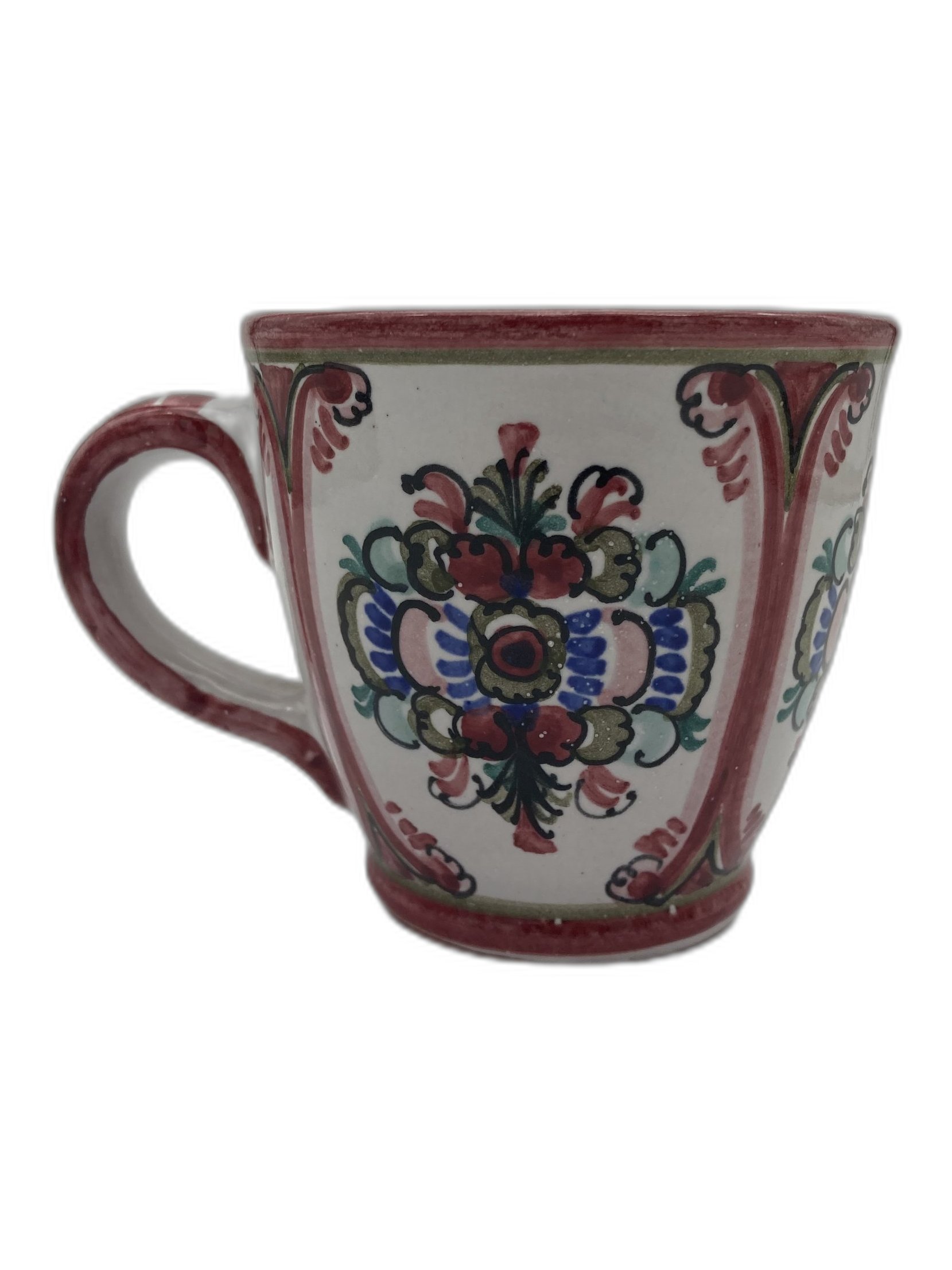 Diese Keramik-Tasse bringt bayerischen Landhaus-Charme an den Frühstückstisch. Das leuchtende Dekor in Rot, Blau, Grün und Rosé ist sorgfältig von Hand bemalt – jedes Stück mit unverwechselbarem Unikat-Charakter.