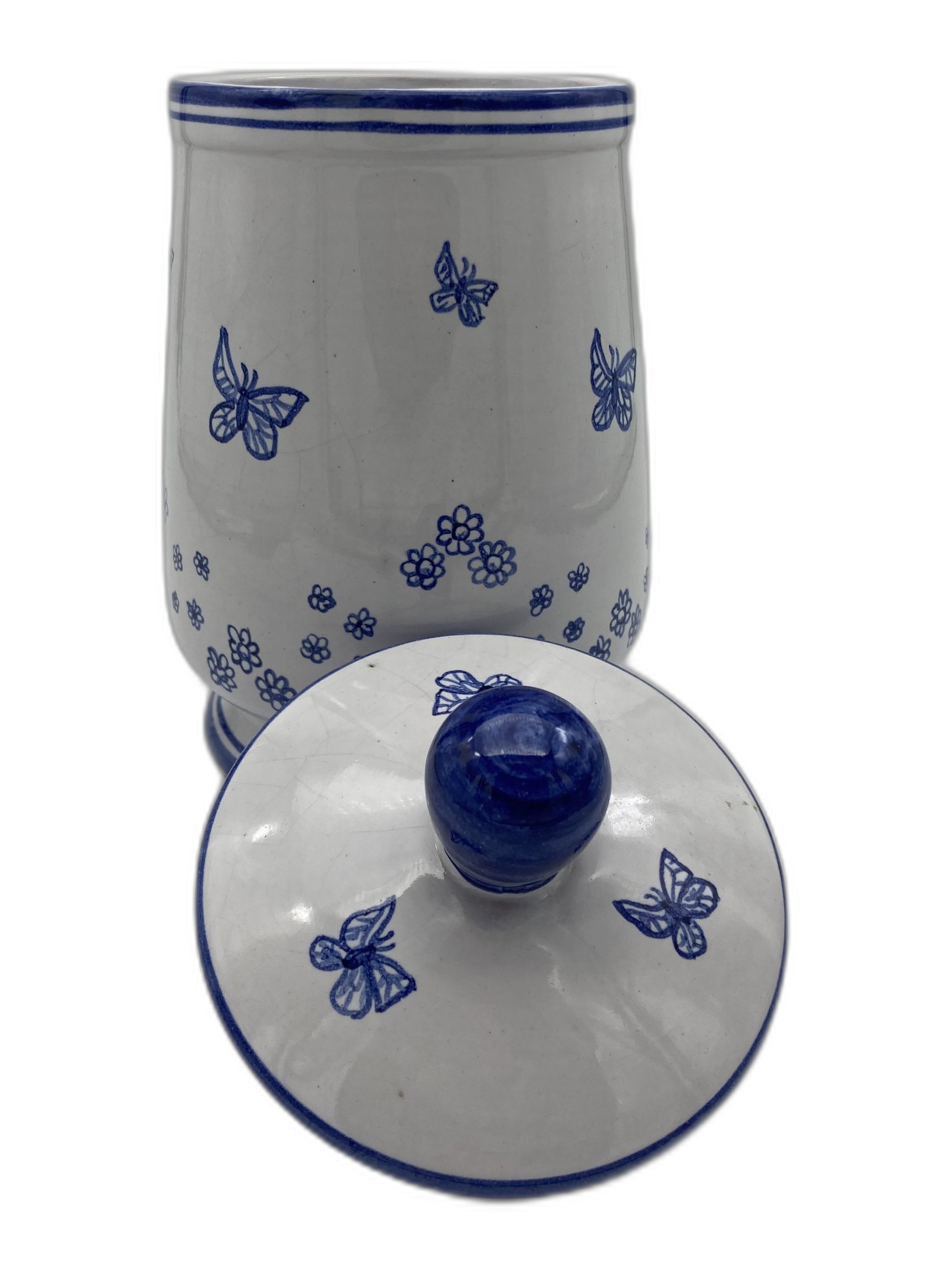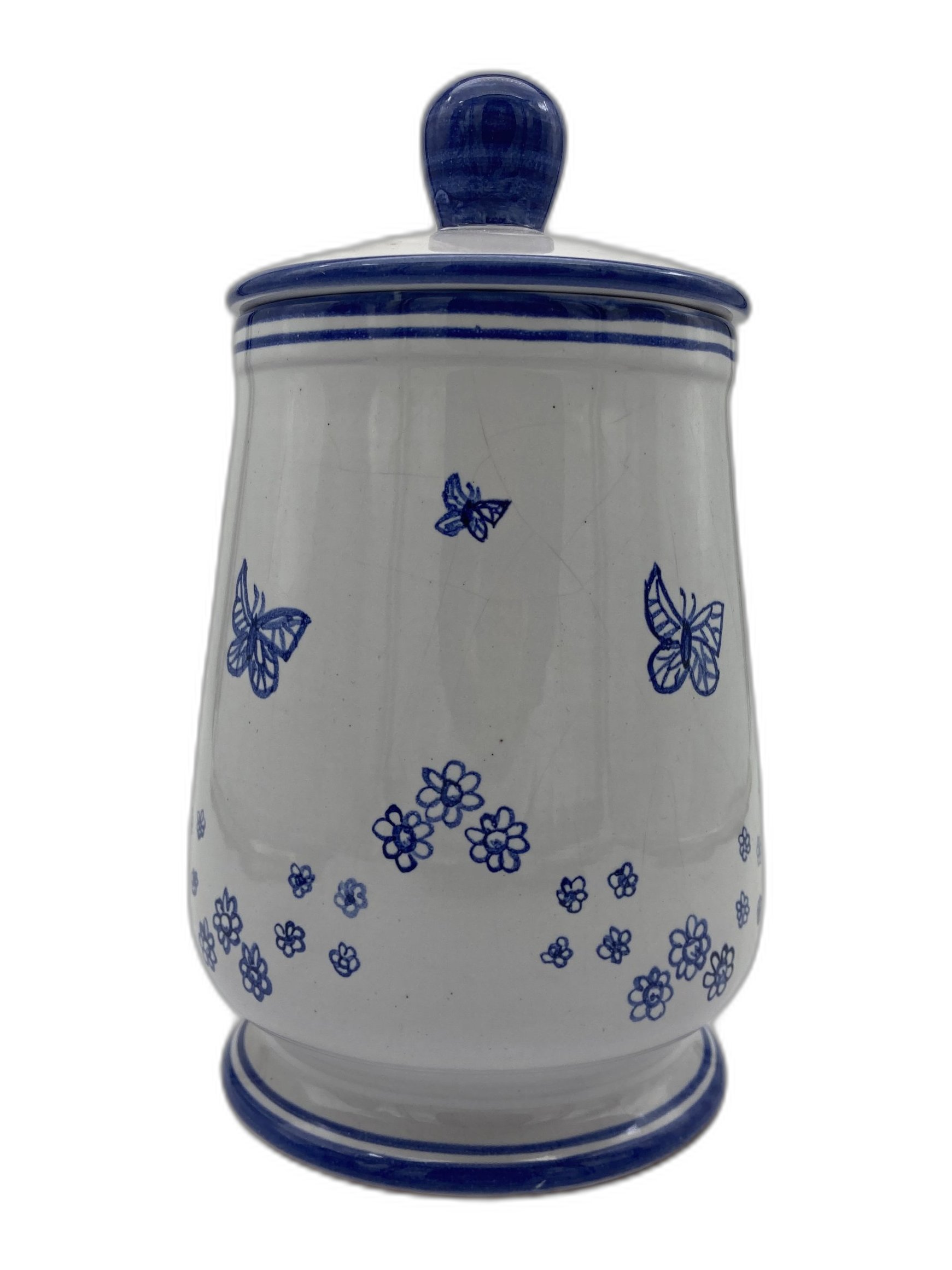 Leicht und fröhlich: Diese bayerische Vorratsdose bringt mit ihrem blau-weißen Dekor aus flatternden Schmetterlingen und kleinen Blüten frischen Charme in deine Küche. Der runde Deckel mit griffigem Knauf schließt die Dose formschön ab und macht sie zum hübschen Blickfang auf dem Regal oder Frühstückstisch.